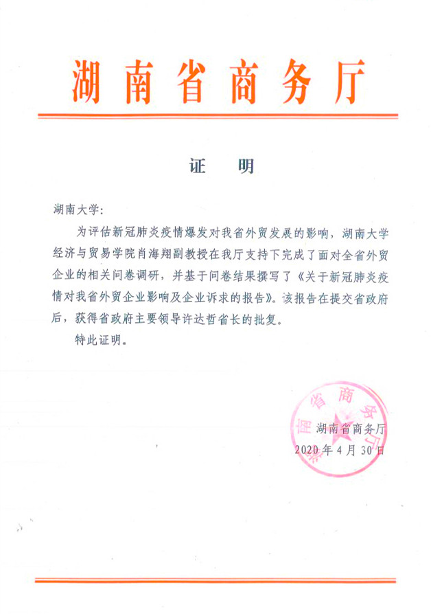 近日,从湖南省商务厅传来消息;为评估新冠肺炎疫情爆发对我省外贸发展的影响,球王会肖海翔副教授在我厅支持下完成了面对全省外贸企业的相关问卷调研,并基于问卷结果撰写了《关于新冠肺炎疫情对我省外贸企业影响及企业诉求的报告》。该报告在提交省政府后,获得省政府主要领导许达哲省长的批复。