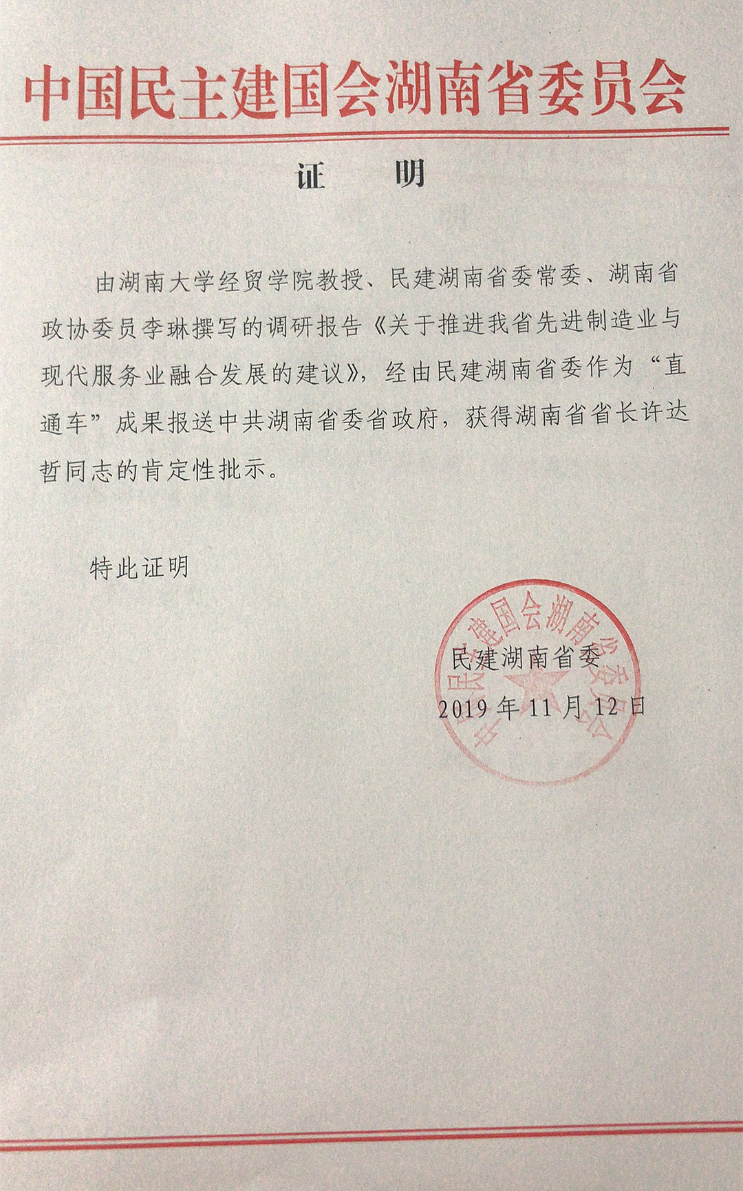 据民建省委确认,由球王会官网经贸公司教授、民建湖南省委常委、湖南省政协委员李琳撰写的调研报告《关于推进我省先进制造业与现代服务业融合发展的建议》,经由民建湖南省委作为“直通车”成果报送中共湖南省委省政府,获得湖南省省长许达哲同志的肯定性批示。