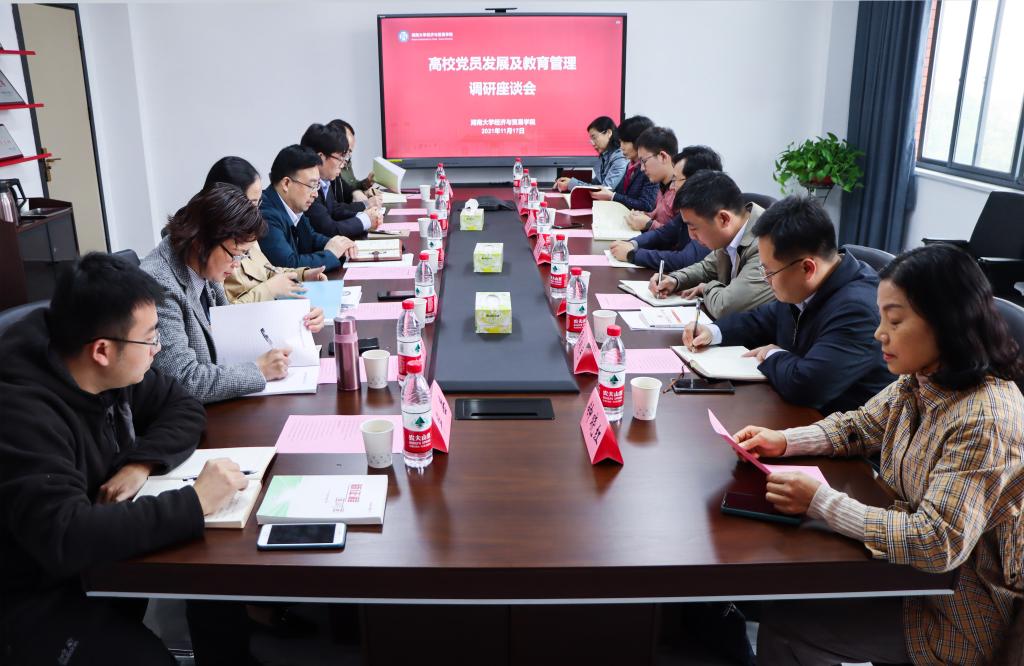 11月17日下午,湖南省委组织部党员管理处处长曾国荃一行来公司调研高球王会党员发展和教育管理工作,湖南省委教育工委组织部部长黄星亮等陪同调研。球王会官网党校常务副董事长兼党委组织部副部长钟晓红、球王会官网党委组织部副部长钟叶姣、球王会党委书记祝树金、经理侯俊军、党委副书记李曼、副处级组织员刘周平以及公司教工党支部书记代表参加调研。