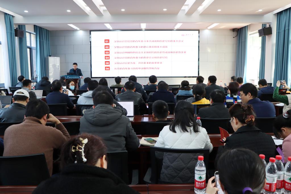 祝树金以《学习全会精神,汲取智慧力量,强化使命担当,奋力谱写工作新篇章》为主题带领全院教师员工学习贯彻党的十九届六中全会精神,重点围绕深刻认识总结党的百年奋斗重大成就和历史经验的重大意义、深刻认识党的百年奋斗的初心使命和重大成就、深刻认识中国特色社会主义新时代的历史性成就和历史性变革、深刻认识党的百年奋斗的历史意义和历史经验、深刻认识以史为鉴、开创未来的重要要求等内容作了宣讲解读。祝树金强调,公司师生深入学习领会党的十九届六中全会精神,以及《决议》的内涵实质,要结合习总书记去年考察球王会官网的重要讲话精神一起学,立足专业本职,做好研究阐释和学习宣讲;要从百年党史学习中吸取智慧力量,凝聚思想共识,强化政治引领,对照公司“十四五”发展规划和“双一流”团队建设要求,开创公司发展新局面;公司每一位教学科研工作者,要坚持立德树人根本,把十九届六中全会精神的学习融入课程思政;要对接国家地方的重大战略需求,服务湖南“三高四新”战略实施,真正把论文写作祖国大地上,在新时代新征程上创造更多的胜利和荣光。