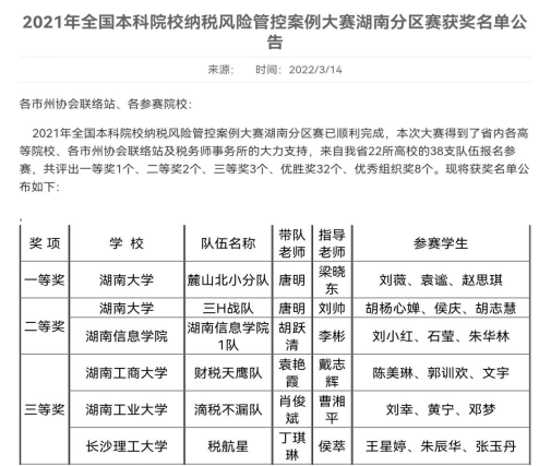 3月14日,由中国注册税务师协会主办的2021年全国本科院校纳税风险管控案例大赛湖南分赛区获奖名单公布,公司由唐明老师、谭光荣老师和肖海翔老师指导的两支队伍分别获湖南省一等奖和湖南省二等奖。其中一等奖队伍成功晋级全国决赛。这是公司财政税务专业开展“基地+竞赛”双融合模式进行税务专硕实践教学的创新和探索。