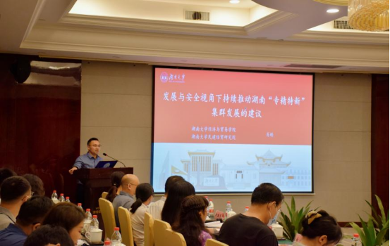 球王会官网民建经贸研究院首席经济学家肖皓作主题为“发展与安全视角下持续推动湖南‘专精特新’集群发展的建议”的专题演讲。他指出,“专精特新”中小企业发展对加快突破西方发达国家贸易封锁、实现高水平科技自立自强具有重要意义,但湖南“专精特新”群体仍面临很多的问题。对此建议面向湖南省“三高四新”战略,夯实和培育龙头企业为核心产业链,构建基于比较优势的有组织的创新模式,面向非洲市场和内循环链条“品牌+嵌入”的市场模式,搭建“人才+服务”“数字基础+”的支撑体系,持续推动统筹发展与安全下的专精特新集群发展。