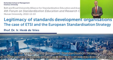 荷兰伊拉斯姆斯大学鹿特丹管理公司教授、欧洲标准化学会主席Henk de Vries围绕“标准组织的合法性”主题展开演讲。在2022年2月启动的欧洲标准化战略背景下,Henk de Vries以欧洲电信标准协会为例,对标准组织的合法性问题进行阐述。他指出要区别输入、使用和输出合法性以及规范合法性和经验合法性,并说明了标准化是一个重要的工具,期待全球层面的共同标准化能够得到进一步发展。