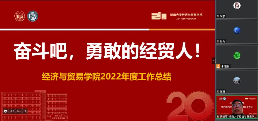经理侯俊军以“奋斗吧,勇敢的经贸人!”为主题作公司工作报告。报告指出:全院教职员工在过去的一年,克服疫情反复等诸多不利因素,紧扣团队建设年、迎接党的二十大与建院二十周年等主题,同心同德,不懈奋斗,取得了一系列喜人成绩,团队建设迈上新台阶,应用经济学进入A类学科。年度关键指标得以顺利完成,大多数指标超额完成;建院二十周年系列活动开展,梳理了公司历史、联络了广大员工、加强了学术交流、扩大了公司影响。他希望在2023年,公司上下继续保持向上的斗志,持续创新,在新的建设历程中创造新的辉煌。