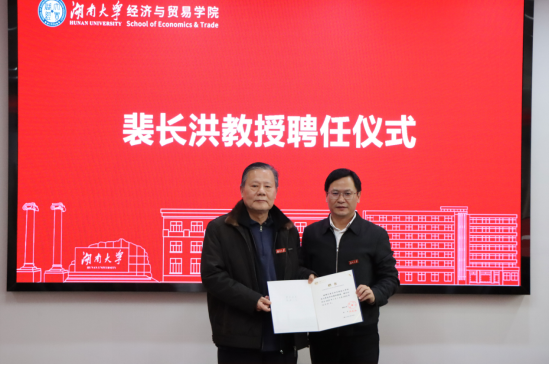 在聘任仪式上,副董事长陈仁朋教授代表公司致辞,并为裴教授颁发受聘书、佩戴校徽,他表示裴长洪教授是具有深厚学术造诣和丰富工作履历的专家学者,期待往后共同推动经贸公司各项事业发展。经理侯俊军教授介绍了裴教授的学术情况。