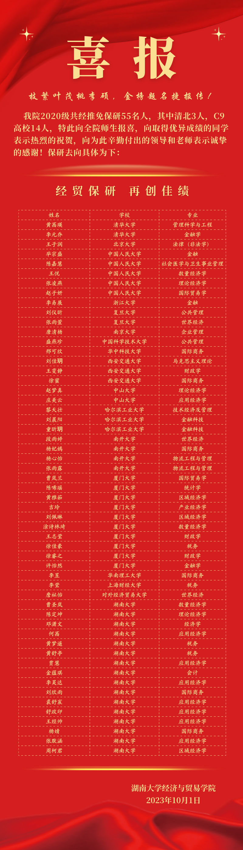 公司2020级共经推免保研55人,其中清北3人,C9高校14人,特此向全院师生报喜,向取得优异成绩的同学表示热烈的祝贺,向为此辛勤付出的领导和老师表示诚挚的感谢!