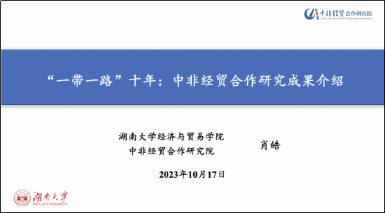 会上,公司副经理、中非经贸合作研究院执行秘书长肖皓作了主题为“‘一带一路’10年:中非经贸合作研究成果介绍”的分享。肖皓指出中非经贸合作研究院是为贯彻落实习近平总书记中非合作论坛北京峰会开幕式提出的“八大行动”,由湖南省委常委会提出、立足湖南中国-非洲经贸博览会和中非经贸深度合作先行区两个国家级平台,致力推动中非经贸合作交流长效机制的智力支撑平台;在过去3年建设中,中非经贸合作研究院在专业咨询、科研项目、人才培养、调研交流等诸多方面取得了较好的成绩。随后,重点汇报了《非洲数字经济发展指数与中非数字经济合作报告(2023)》和《中国企业投资非洲报告2023》两项最新研究成果。并针对当前中非经贸研究面临的主要问题,肖皓呼吁应汇集多方智慧,加强非洲经贸领域研究国际、国内交流与合作,搭建研究信息共享平台、推动联合研究及成果转化、打造学术期刊和智库专刊、完善中非经贸专业人才培养体系,为中非经贸合作长期发展贡献新的力量,得到与会嘉宾一致认可。