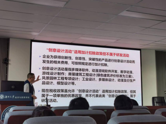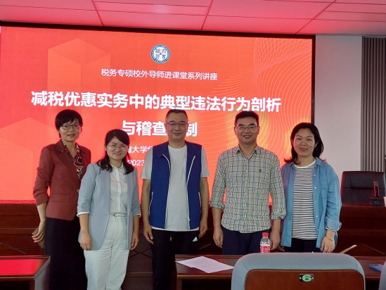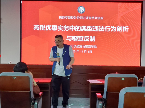 2023年11月1日下午,国家税务总局稽查人才库成员、中国注册税务师协会最具影响力税务老师、湖南省财税法学研究会常务理事、球王会税务硕士校外导师段文涛来公司为税务硕士开展《中国税制》课程授课,授课主题为《减税优惠实务中的典型违法行为剖析与稽查反制》。公司税务相关老师及全体2023级税务专业硕士研究生参加。本课程由公司副教授、财税系支部书记唐明主持。