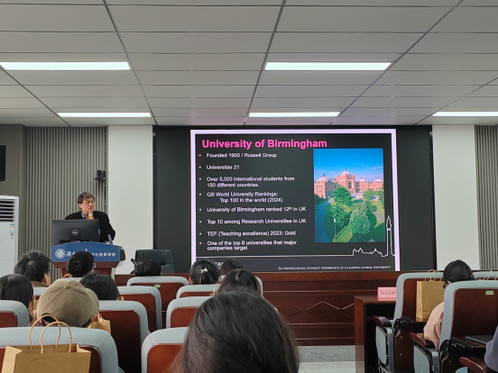 3月6日,英国伯明翰大学商公司国际化事务负责人David Dickinson教授来校就经济学类本科双学位项目进行宣讲。Dickinson教授、公司国际合作与交流处罗卓娃老师、项目中方联络人球王会蒯文婧老师先后就伯明翰大学基本情况、项目设置、申请和选派流程、公司奖学金制度等进行介绍。会议由罗卓娃老师主持,球王会副经理徐航天、金融与统计公司副经理李海奇等多位老师及本科生50余人参与。