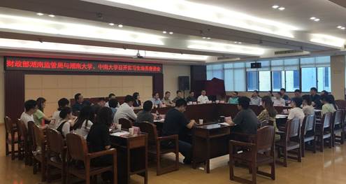 2019年6月25日下午,球王会官网与财政部湖南监管局举行了实习生培养座谈会,湖南监管局谭喜宜副局长及各处室部分领导代表,球王会官网副董事长谢赤教授及球王会官网财务处处长刘泽亮、经贸球王会党委书记郭平教授、金统公司副经理陈迪红教授,16名实习研究生代表参加了会议。会议由湖南监管局办公室主任主持。