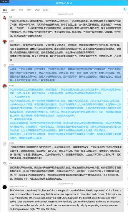 2016级、2019级本科生于9日下午通过班级、年级组织线上会议集中观看,共计435人,观看过程中不少同学在群组中发起讨论,表达自己对本次疫情的看法。其中2016级职工ISSAKA LABO BOUCHE也积极参与讨论,她提到:“本次疫情传播很快,中国在疫情防控和治疗方面拥有领先的技术和经验,中国采取了最勇敢、最灵活的严格预防和控制措施,为世界公共卫生提供了重要贡献。作为员工,我们只有尊重这些预防措施,保持高尚道德,才能有所帮助。”2019级国际经济与贸易魏珈谈到:“何谓大国?在今天的这一堂课里,我得到了这道题的答案。我们或许不能像医护人员一样勇敢冲上前锋,也不能如警察一般稳重的保护身后,但我们依然有着为祖国而不断流淌的血液。这场疫情战,我们必将获得胜利!”