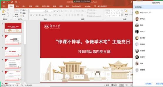 为深入落实公司疫情防控期间工作安排,进一步提升支部党员疫情防控的自觉意识和担当意识,在此次战“疫”中带头做“守护者”、“修行者”、“识途者”,3月1日,经贸院研究生导师团队第四党支部开展了主题为“停课不停学,争做学术宅”的主题党日活动,本次会议由支部书记唐芳主持,支部党员通过腾讯会议APP参加,会议由疫情防控通知、党员疫情防控期间心得体会以及“学术宅”软件推荐三个部分组成。