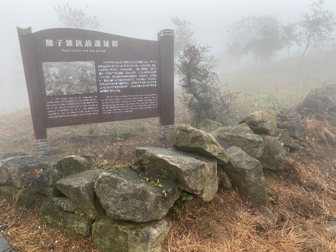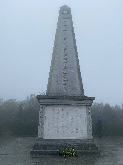 下午1点钟左右师生们到达影珠山抗战遗址公园参观。1939年至1944年,影珠山作为第三次长沙会战的主战场之一,战况尤为惨烈。遗址公园现存影珠山抗战将士墓、五十八军指挥部旧址及新10师指挥部旧址、腰子坡战壕等多处遗迹遗址。伴着丝丝细雨,大家沿着山路前行,整个山体被云雾笼罩,更显庄严肃穆。老师和同学们沿途参观了山上的几处抗日遗址及纪念碑,党员们感受到了英勇的中国军民在长沙保卫战中全歼日寇,书写“倭寇未曾留片甲,英魂驻此障长沙”的壮丽篇章。在抗日战士公墓碑前,全体人员默哀一分钟并向抗日战士三鞠躬致敬。