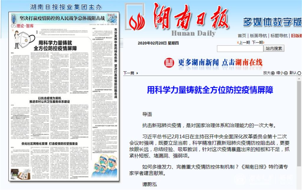中国科公司院士、湖南省院士咨询与交流促进会会长谭蔚泓教授作为《湖南日报》特约请专家学者提出《用科学力量铸就全方位防控疫情屏障》:一是保持信息公开,二是加强疫情演练,三是保障科研供给,四是注重基础科研与临床实践相结合,五是改革医疗领域人才培养模式。
