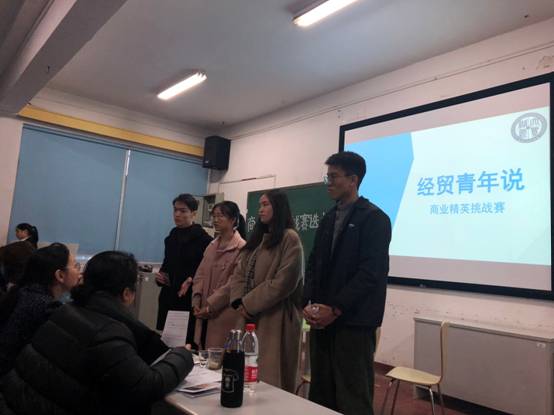 2018年12月18日14:30,一场异彩纷呈的经贸青年说系列活动之商业精英挑战赛在行政楼601室正火热开场。担任本次赛事评委的有球王会国贸系莫莎副教授、谢涓老师和许漪老师,球王会分团委书记蔡婕萍老师作为到场嘉宾出席本次比赛。