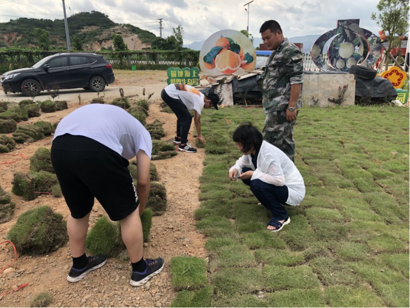 炎炎的夏日也难以阻挡同学们义务帮助他人和将奉献青春小我的心情,7月18日下午三点整,两位老师和“经贸八杰”员工团队准时到达了需要进行劳动的农场。在经过农户的简单指导之后,同学们便撸起袖子开始进行“铺草坪”这一义务劳动。这一项劳动具体是将呈块状的青草铺满空地,使之成为一片草坪。下午的天气十分炎热,但是这丝毫没有影响同学们的劳动热情,老师和同学们秉承着“劳动最光荣”理念,在烈日下挥汗如雨。但是因为同学们之前没有过多地接触过这一类的农活,所以在劳动过程中也遇到了一些困难。但在老师和农户的指导下,在团队成员们齐心协力下,一大块青草坪终于被铺好了。看着这几个小时的成果,所有人的脸上都洋溢着笑容。夏天里的这一抹翠绿,成了老师和同学们眼中最亮丽的风景。