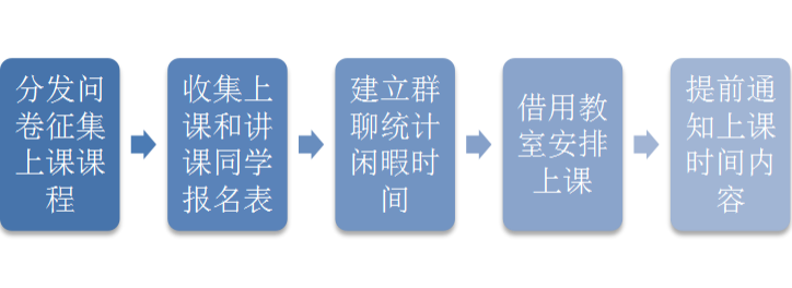 结合上学期的学习情况以及本学期的课程难度,公司决定继续开展同伴课堂以促使同学们互相学习,优化公司学风。首先为了加强上课效果,我们首先通过问卷统计同学们对各课程难度的见解并收集各班听课报名情况,根据报名的人数和收集到的问卷决定开设哪门课程,这样大大提高了上课效率。统计了信息后,我们了解到同学们普遍认为全英文课程《国际经济学》以及往年挂科率极高的《税收学》需要开课。接着我们建立群聊,收集听课同学和小老师的空闲时间以便安排上课。不过因为同学们在不同的时段都有事,因此我们再次发布群投票,遵从少数服从多数的原则,选取了听课人数最多的时段。由于本学期开课数目较少,而且课程难度较大、上课内容比较多,每节课的时间相较于上个学期都增加了二十分钟。上课时间是每周周二、周三的19:30到20:00。通过教务系统,我们长期借用了水教307教室比上学期每周借一次教室方便了好多。最后在开课前天晚上,我们具体通知了每一位同学也通过各班学委将上课内容和地点发送到各班班群,让没有报名但对部分课程内容不够了解的同学可以补缺补漏。